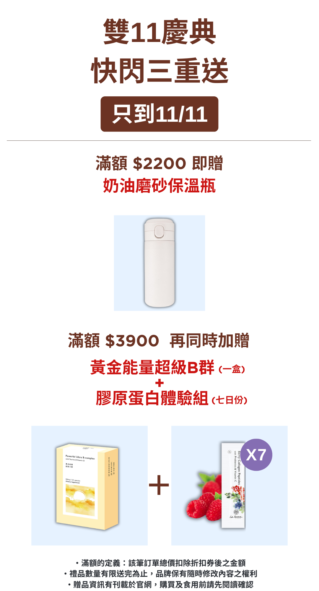 至2025-11-30T16:00:00.000+00:00截止 全店,🎁雙11慶典加碼!滿$3900 再加贈:黃金能量超級B群!